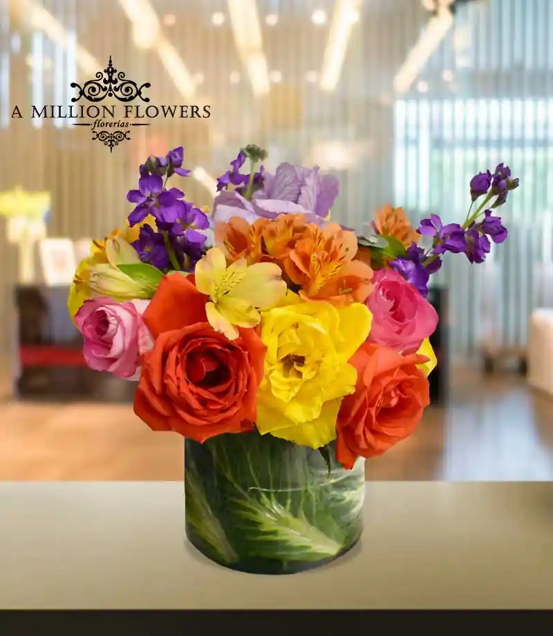 Simplemente un sencillo pero colorido Arreglo floral con Rosas de 3 colores distintos, acompañada de Matiola morada y un florero cilíndrico decorado muy original.