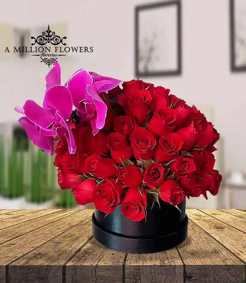 Envía hasta la puerta de su casa este hermoso Arreglo de más de 50 Rosas rojas con orquídea Morada. El color morado en la orquídea significa prosperidad. A través de este Arreglo floral expresa admiración, amor y respeto.
