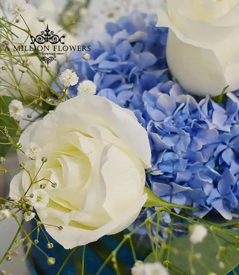 Si deseas adornar un evento social, cumpleaños, bautizo, o simplemente un regalo para él este diseño es perfecto para ti:  pecera con agua decorativa color azul, y hortensia en el centro rodeada de Rosas blancas. ¡El centro de mesa perfecto!