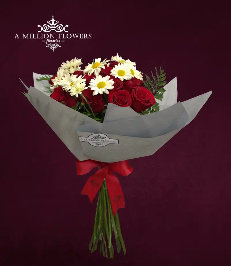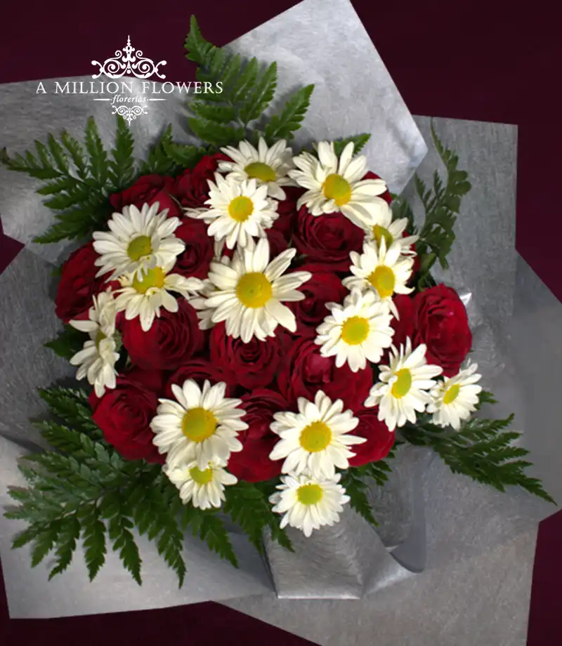 Un ramo fresco y precioso hecho con preciosas rosas rojas y margaritas blancas. El amor nunca pasara de moda y ser detallista menos.